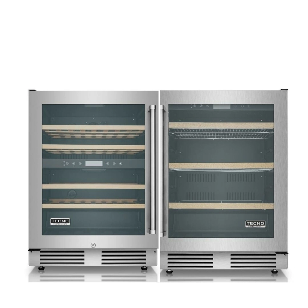 Sofisticado conjunto de Adega e Frigobar Tecno, ideal para conservação de todos os tipos de vinhos, espumantes, energéticos, refrigerantes, sucos etc. Suas portas com moldura em aço inox anti-manchas e robustos puxadores proporcionam uma elegante integração com os mais refinados ambientes. O vidro triplo anti UV recebe gás argônio e uma resistência elétrica que previnem a condensação e melhoram o isolamento térmico para uma temperatura interna mais precisa e estável. O filtro de carvão ativado garante um ar interno de alta qualidade livre de odores e poeira. Permite aplicação no piso ou embutido sem frestas com a porta alinhada com a frente do móvel.