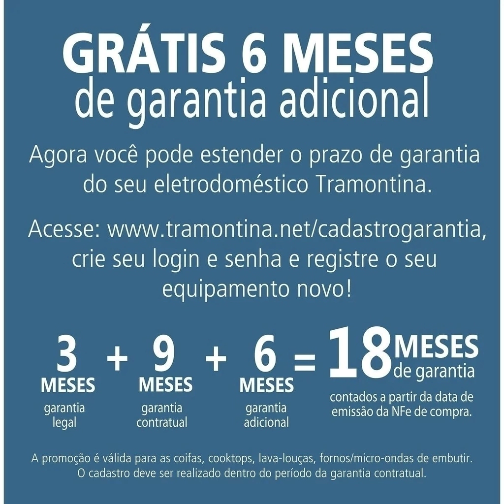 GARANTIA 1 ano. Amplie a garantia para até 24 meses, 6 meses registrando o produto e 6 meses instalando com o Serviço Autorizado Tramontina. Instalação não gratuita. A garantia adicional é válida a partir da data de emissão da nota fiscal de compra.