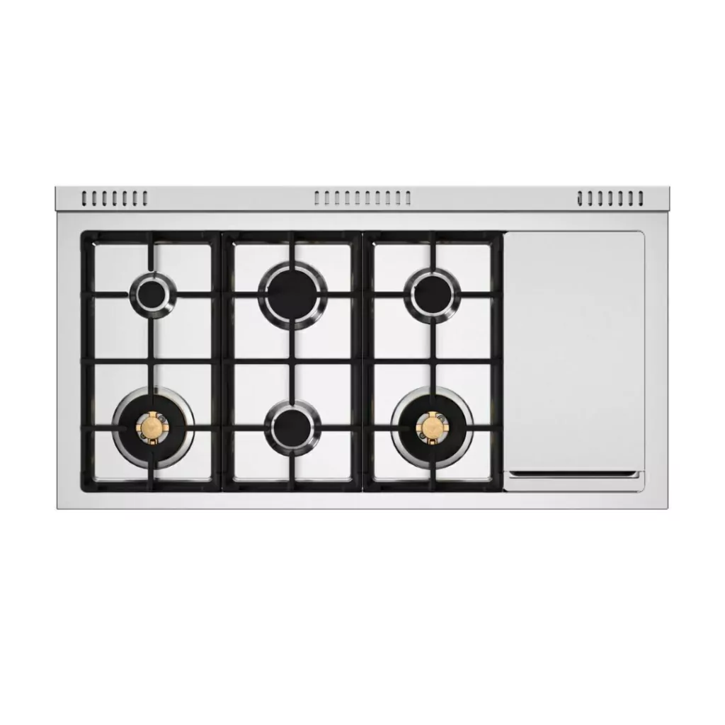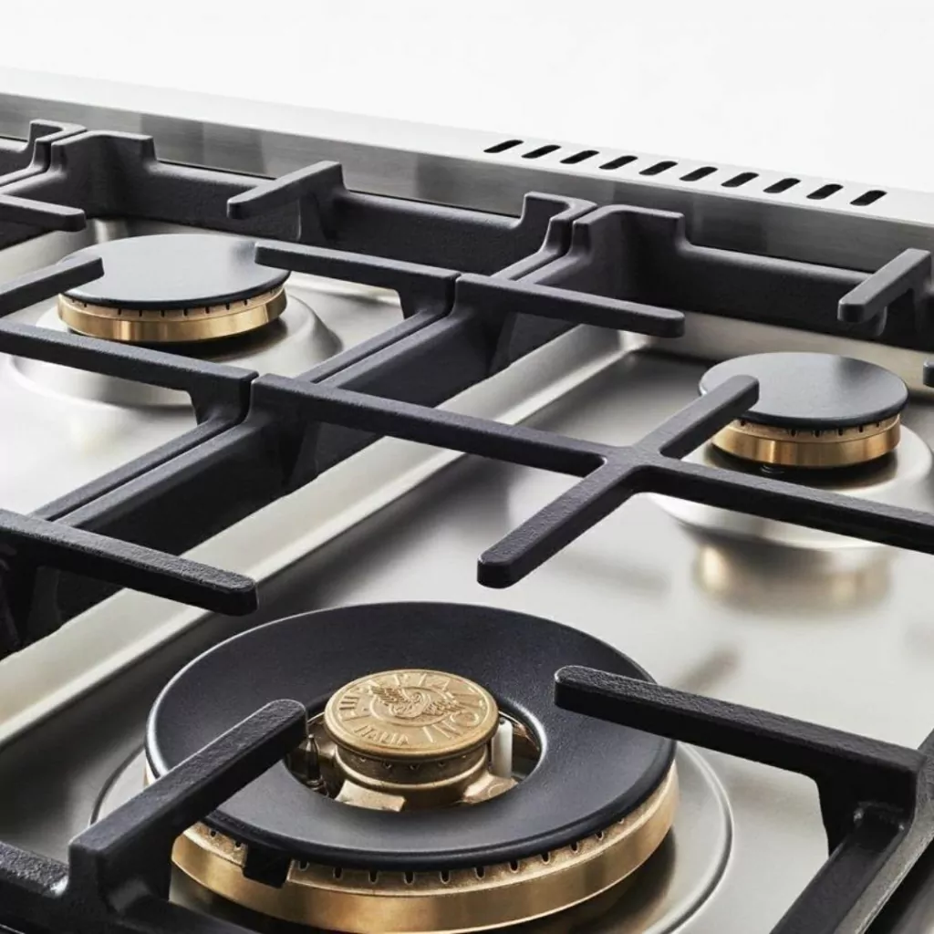 Fabricado na Itália com design profissional, oferece 6 queimadores Sabaf HE Full Brass em latão maciço que inclui dois potentes queimadores Dual Flame de 5.570 W com acionamento sequencial das chamas internas e externas para se desfrutar do calor adequado para todos os tipos de receitas.