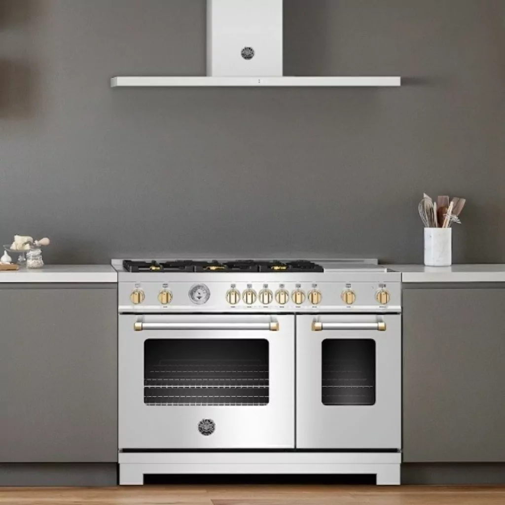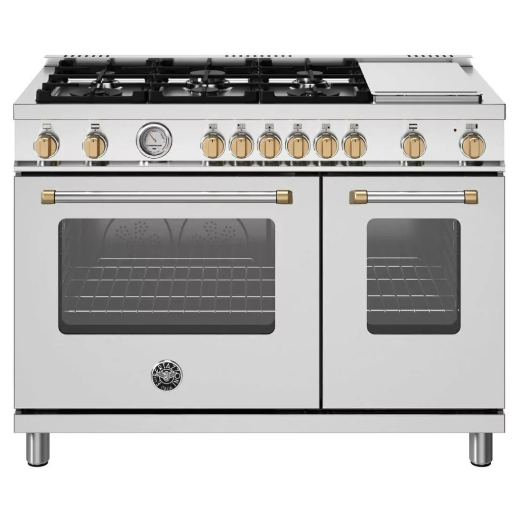 Corrediças telescópicas móveis e o sistema de fechamento Soft Close das portas nos fornos completam o amplo conjunto de recursos oferecidos pelo fogão. O MAS486BTFGMXTLPG pode ser aplicado junto com demais produtos da linha Bertazzoni Master Series equipados com suportes de puxadores banhados a ouro, compondo refinados conjuntos.