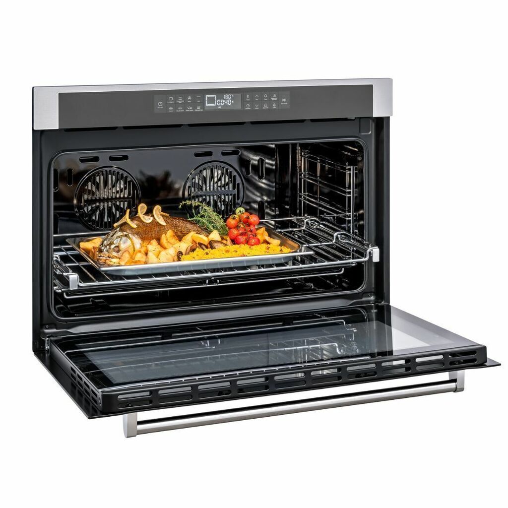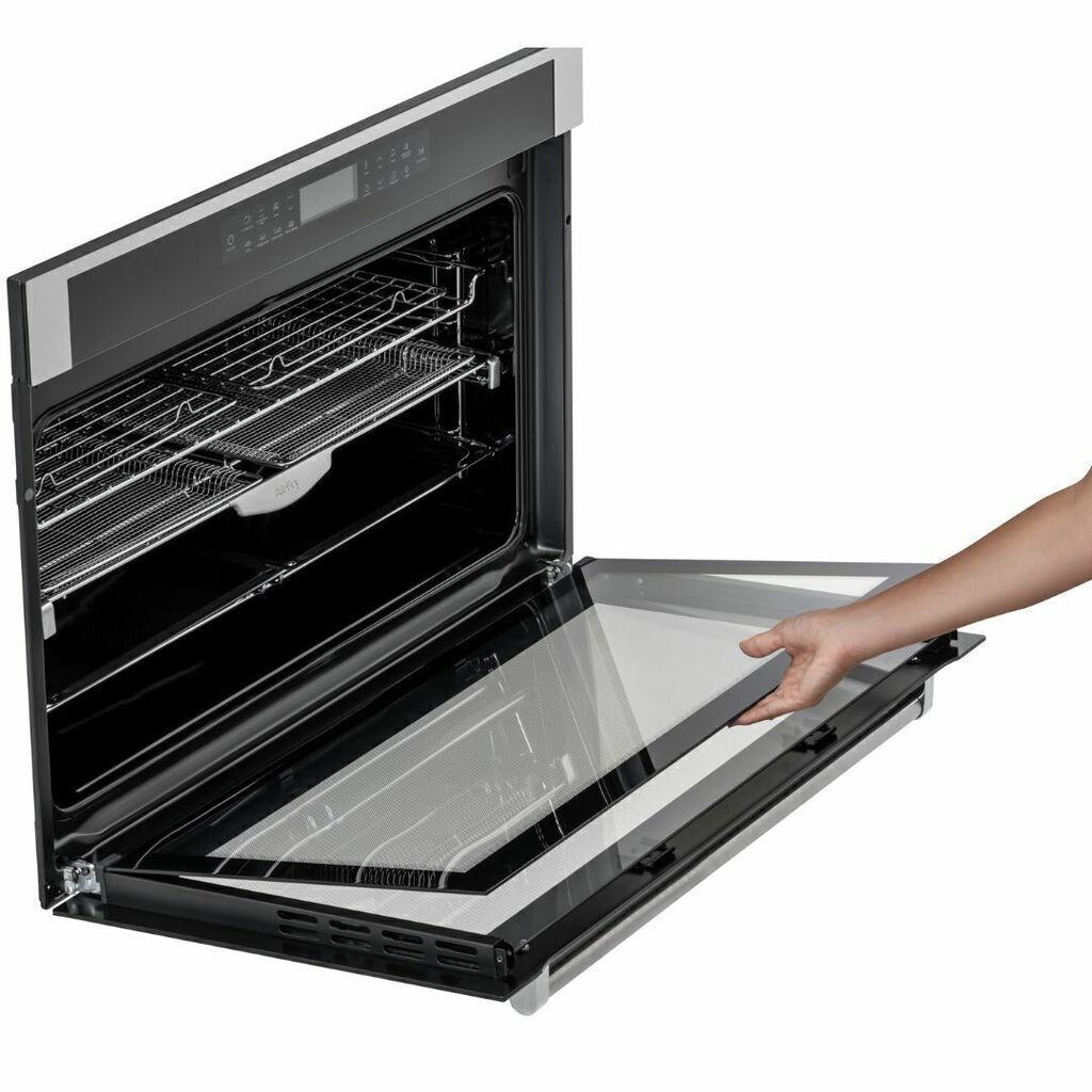 O timer digital possui 3 funções, com relógio, contador de minutos e timer que desliga o forno no final do preparo. O forno também conta com uma bandeja extra profunda para preparar grandes alimentos de forma fácil e prática, prateleiras telescópicas móveis, garantindo facilidade e segurança ao manusear os alimentos, e a função Steam Clean, que utiliza antiaderente Teflon para uma limpeza eficiente e rápida com a aplicação de vapor.